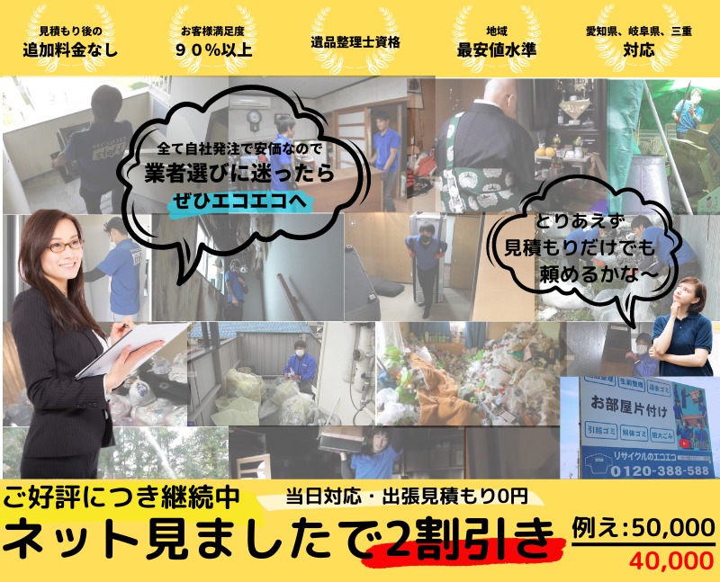 HOME > 当日対応・出張見積もり0円 (800 × 1100 px) (6) 投稿日: Twitter シェア Google+ Pocket B!はてブ LINE ◆おすすめ記事一覧◆ 1 愛知の遺品整理業者(仏壇供養、買取)様々なサービス 2 ゴミ屋敷を徹底お片付けする会社【お部屋の不用品を一掃】愛知、岐阜、三重県 3 家屋解体(家の解体+中身のゴミの処分)坪28,000より 4 【退去ゴミの片付け】ハウスクリーニング/カーテンレール・風呂釜の取り外しまで 5 引っ越しと不用品処分をまとめて(施設、新居)近距離現場 -