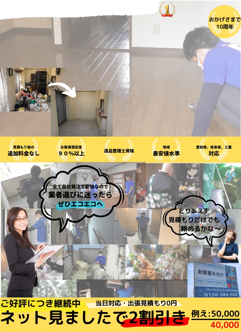HOME > 当日対応・出張見積もり0円 (800 × 1100 px) (6) 投稿日: Twitter シェア Google+ Pocket B!はてブ LINE ◆おすすめ記事一覧◆ 1 愛知の遺品整理業者(仏壇供養、買取)様々なサービス 2 ゴミ屋敷を徹底お片付けする会社【お部屋の不用品を一掃】愛知、岐阜、三重県 3 家屋解体(家の解体+中身のゴミの処分)坪28,000より 4 【退去ゴミの片付け】ハウスクリーニング/カーテンレール・風呂釜の取り外しまで 5 引っ越しと不用品処分をまとめて(施設、新居)近距離現場 -